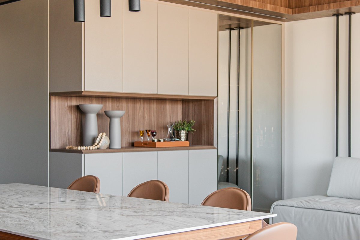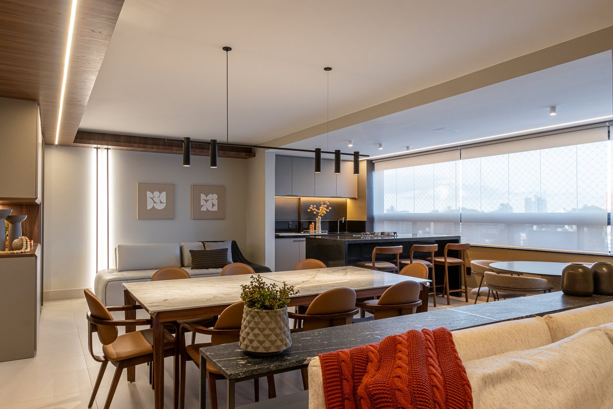 Na sala, buscamos um equilíbrio entre sofisticação e aconchego, com móveis que trazem funcionalidade e elegância. A mesa de jantar em mármore branco Paraná, o sofá espaçoso e os detalhes cuidadosamente pensados garantem conforto para a rotina da família.