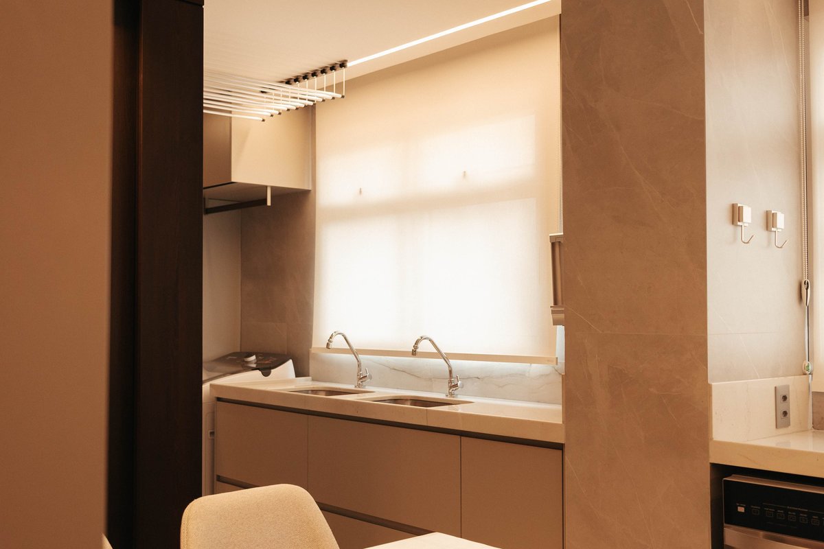 Este projeto consistiu na completa transformação da cozinha, área de serviço e varanda de um apartamento, priorizando funcionalidade, integração e conforto. O layout foi totalmente reconfigurado, com ampliação de acessos, integração de ambientes e marcenaria planejada que maximizou o uso do espaço, combinando tons de cinza e madeira escura.