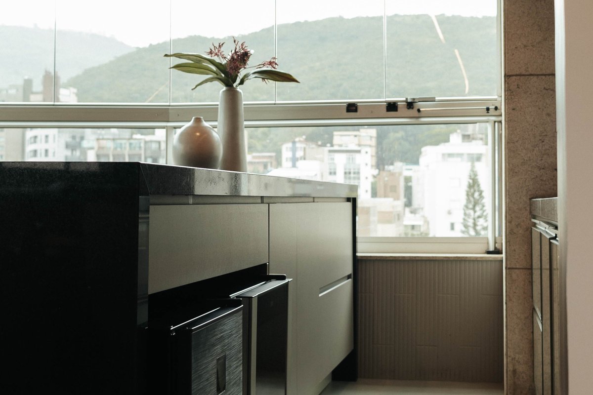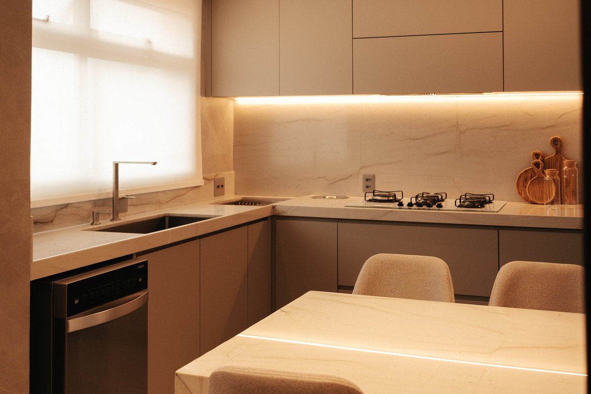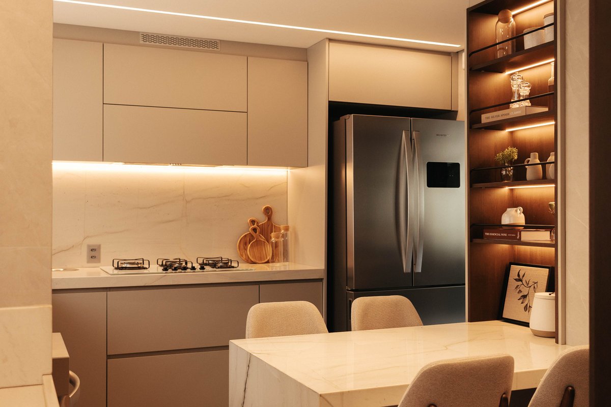 A cozinha ganhou uma despensa e recebeu soluções modernas como triturador, calha úmida, dosador de detergente, cuba generosa, lava-louças, mesa central multifuncional e novos eletrodomésticos. O uso do quartzito Mont Blanc nas bancadas, trouxe sofisticação e resistência.