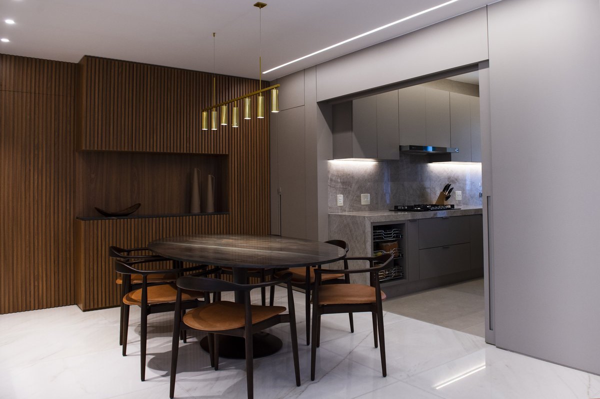 A cozinha pode se integrar ou se fechar para a sala, adaptando-se a diferentes momentos do dia a dia. A estante na sala esconde ou revela a TV, criando um espaço versátil para reunir a família. A varanda foi incorporada ao ambiente, ampliando a sensação de conforto e trazendo a área externa para dentro de casa.