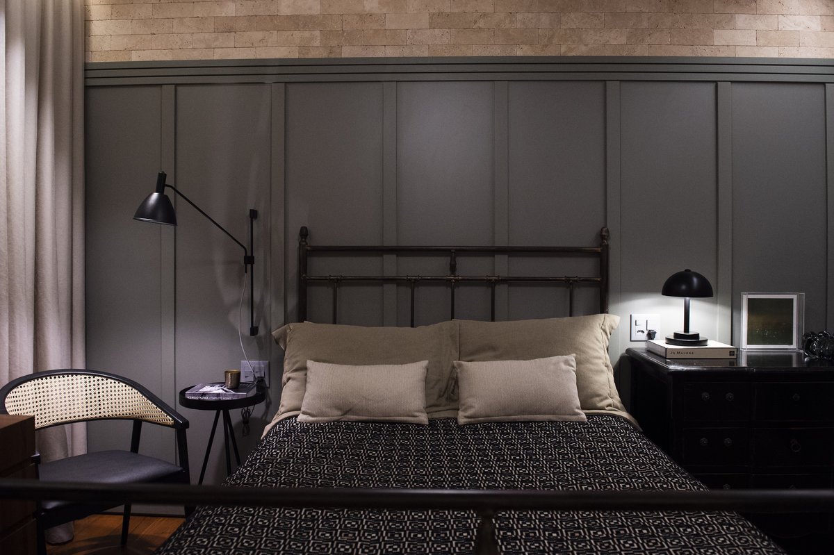No quarto do casal, a história se traduz no design. Partimos de uma cama carregada de memórias afetivas da cliente para compor um espaço elegante e acolhedor, com paredes em verde fechado, tijolinhos e iluminação com toques industriais.