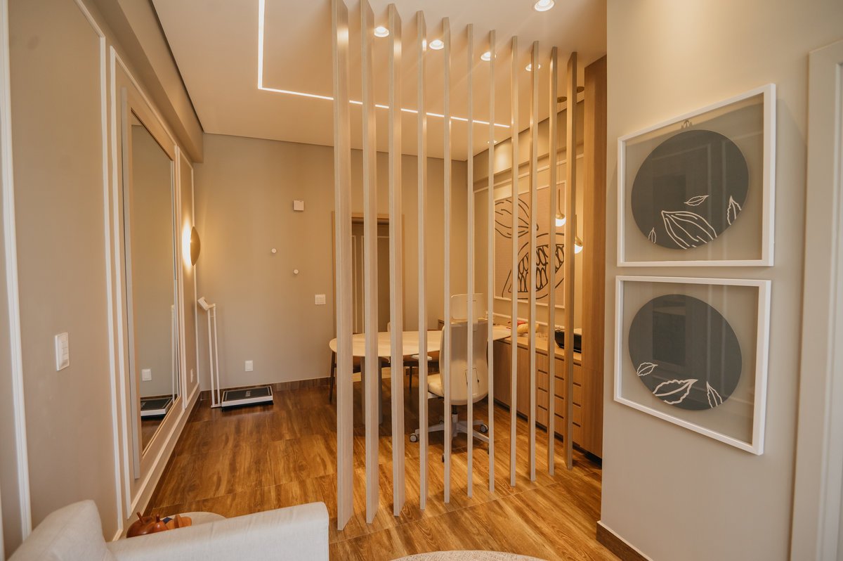 Separando a recepção do consultório, um painel amadeirado trouxe mais sofisticação ao espaço, enquanto um brise divide a copa da sala de atendimento, garantindo privacidade e praticidade. A iluminação foi um ponto crucial, proporcionando eficiência e aconchego ao ambiente.